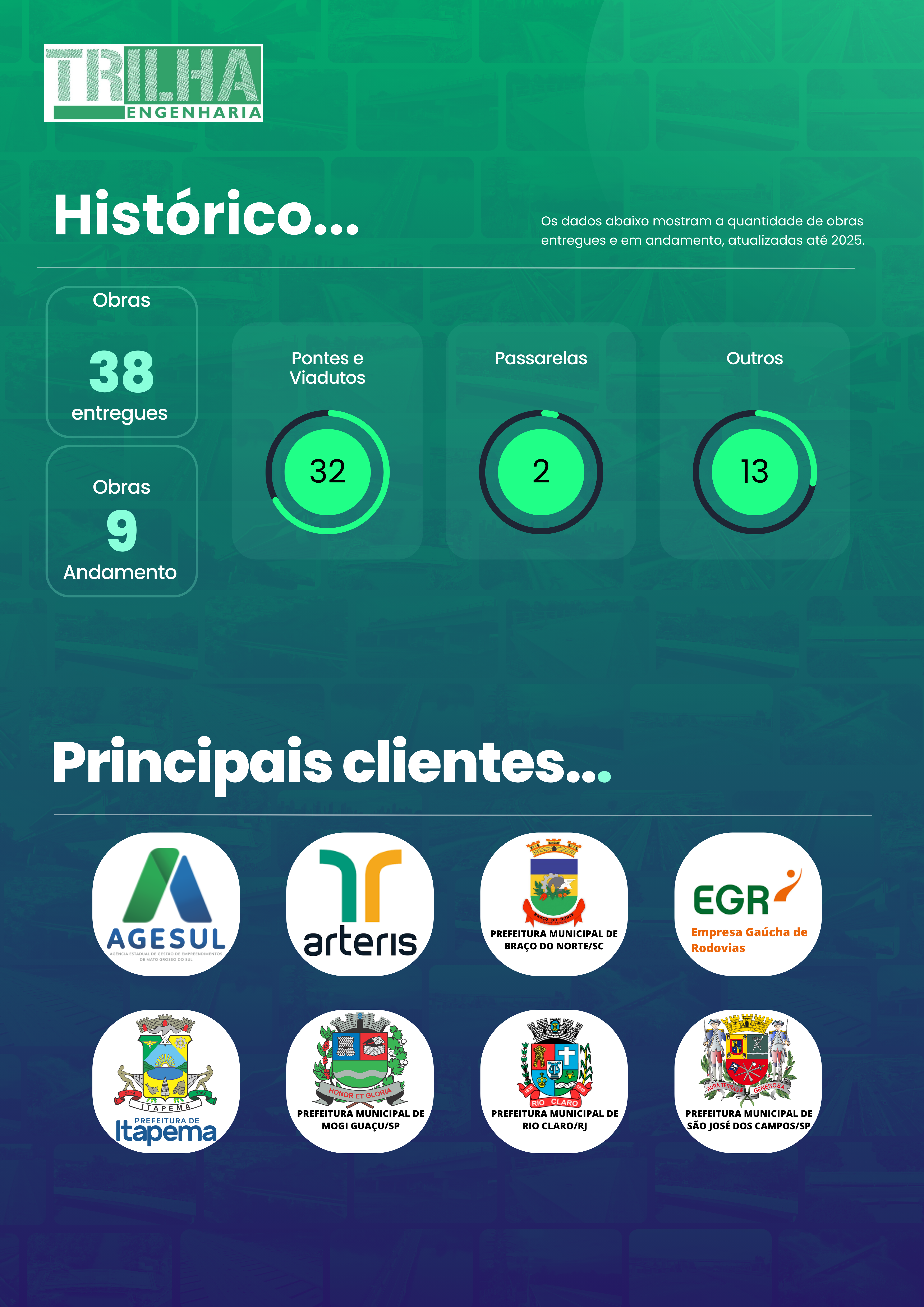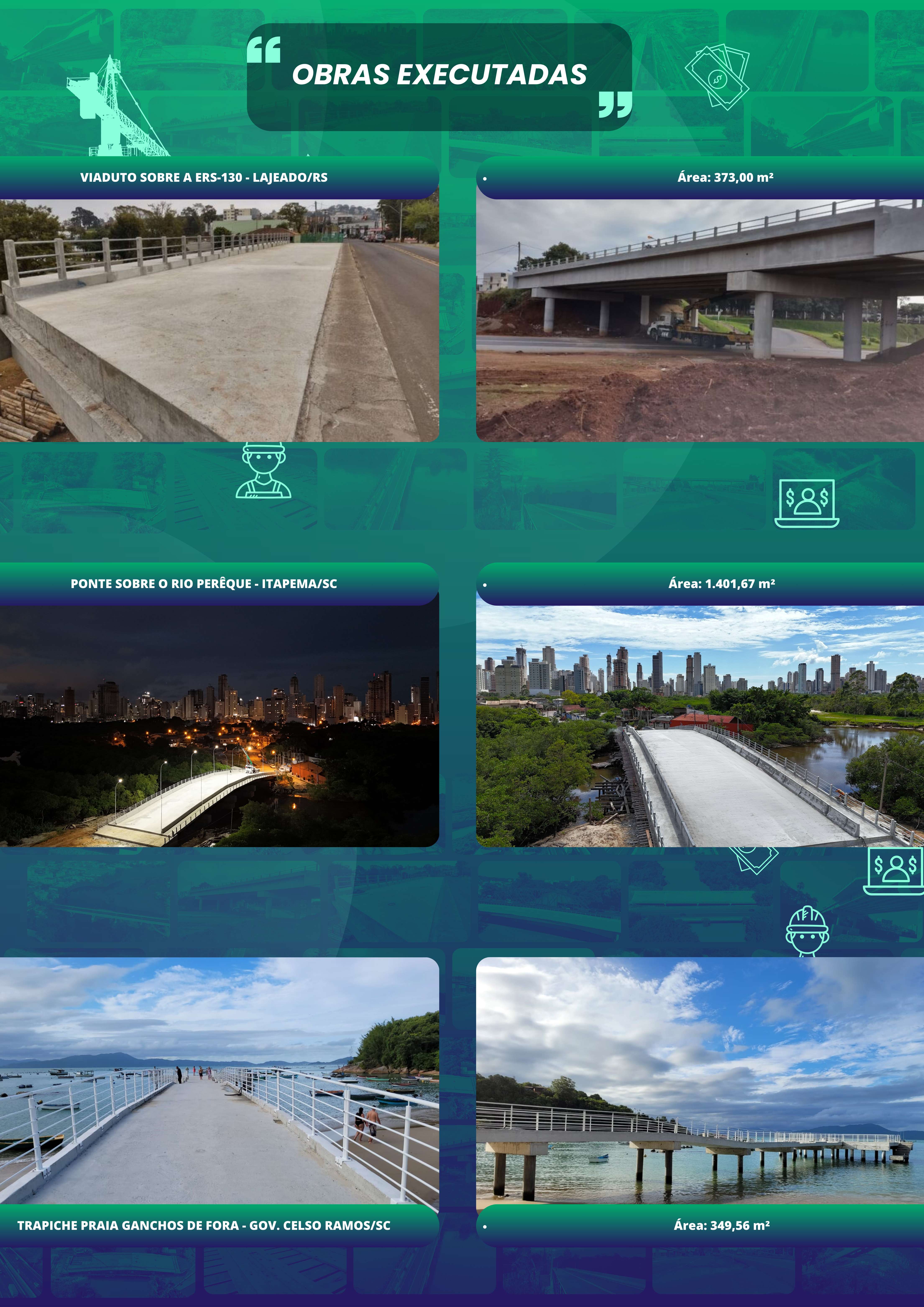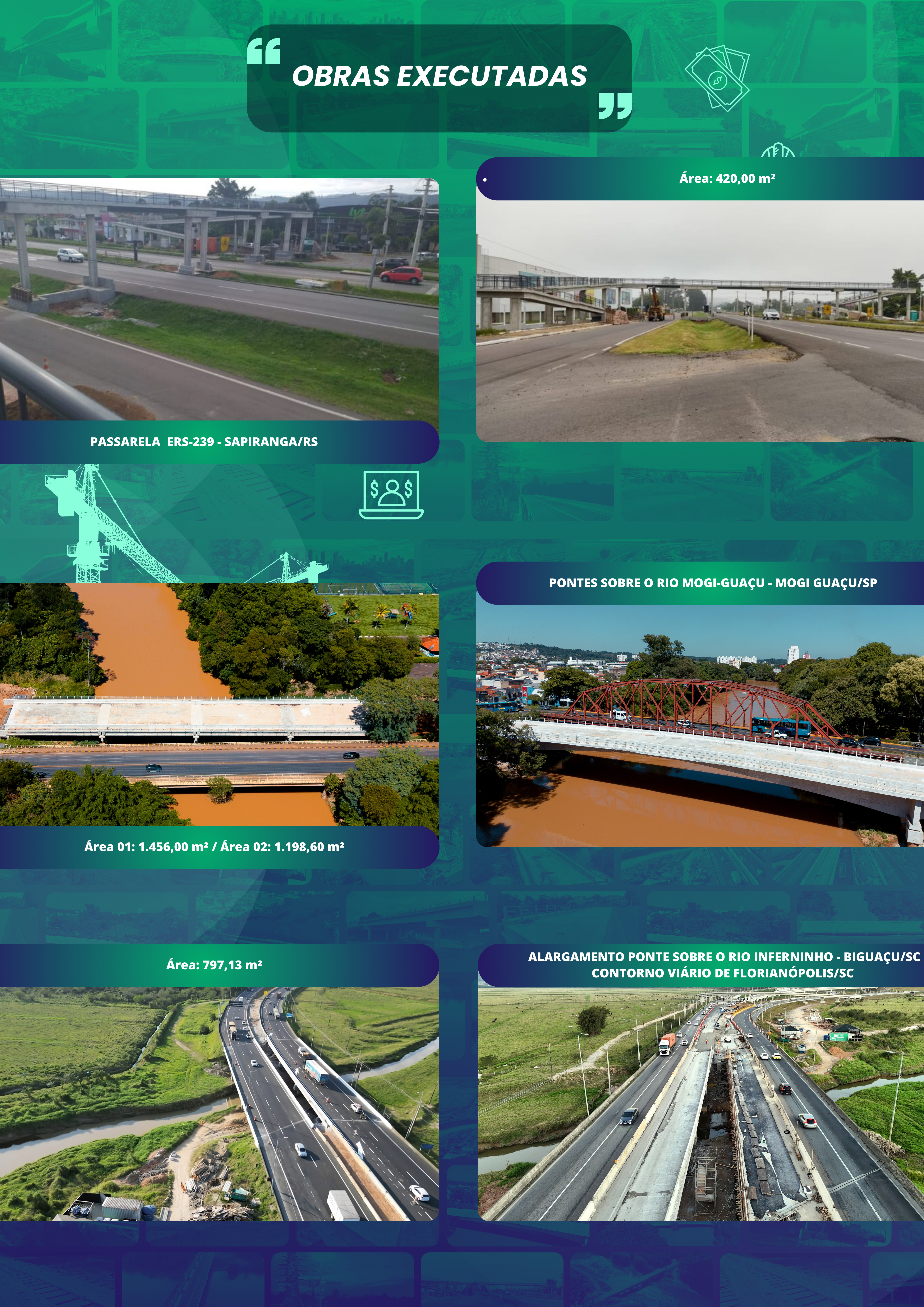 Aqui temos um resumo de nosso portfólio, com os serviços no segmento de Obras de Arte Especiais – OAEs, como Pontes e Viadutos.